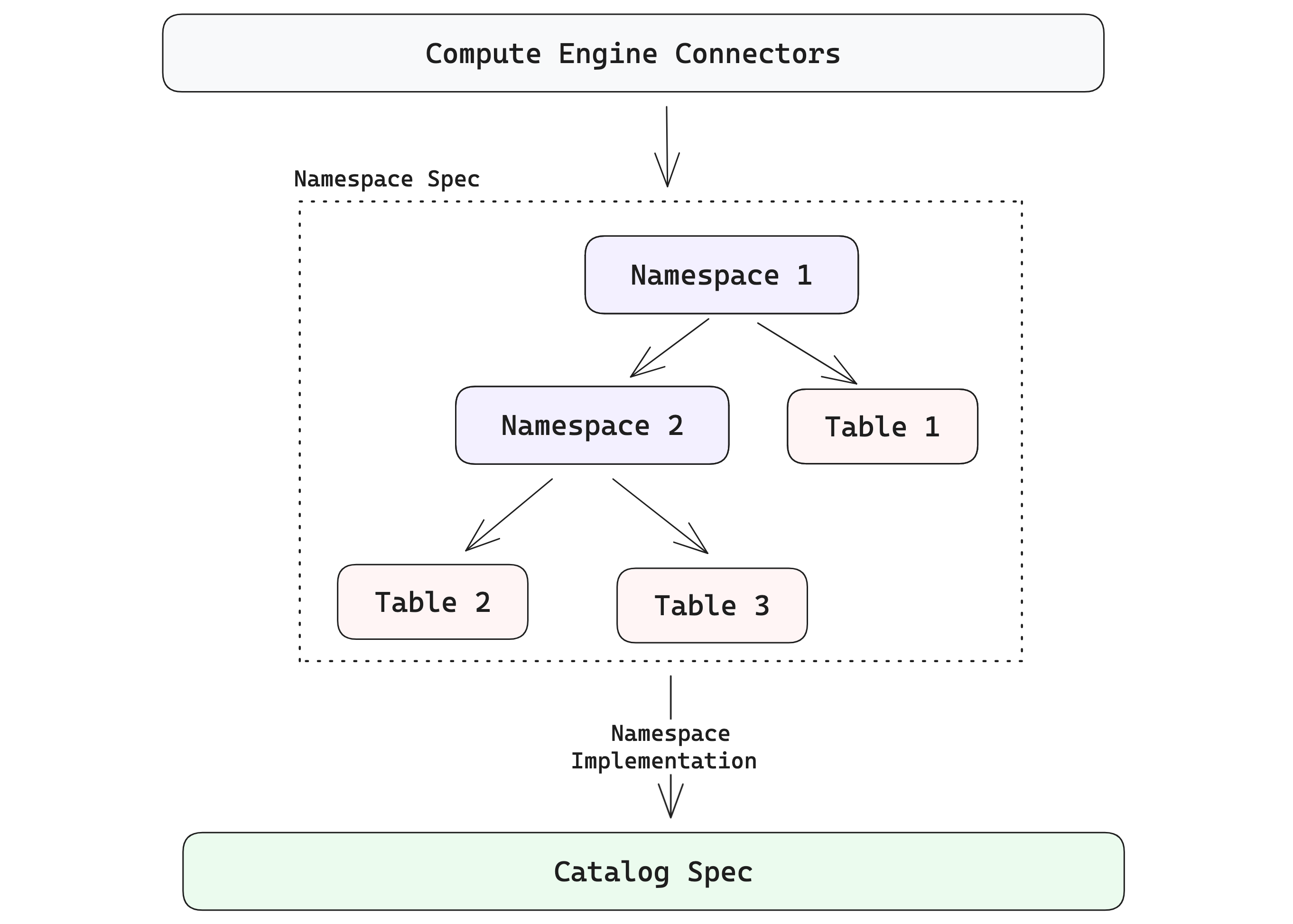 Namespaces are generalizations of catalog specs that give platform developers a clean way to present Lance tables in the structures users expect. The diagram below shows how the hierarchy can go beyond a single level. A namespace can contain a collection of tables, and it can also contain namespaces recursively.